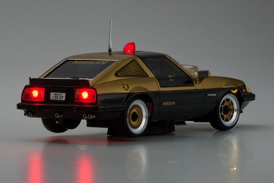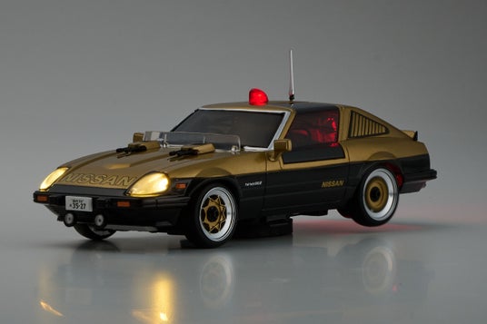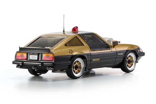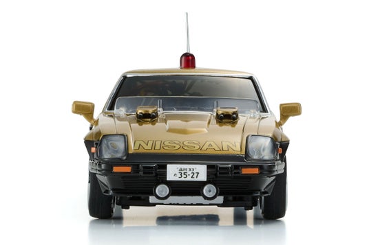 象徴的な主力スーパーマシンであるスーパーZは、主人公・大門団長(渡哲也)の専用車として開発されました。「警察車両 × スーパーカー」の要素を融合させた80年代特撮的デザインの代表格であり、ベース車にはないゴールドを基調とした特別2トーンカラーのボディに、全自動油圧式のガルウイングドアとドアミラーを採用、ボンネット上には催涙弾、リアには煙幕発生装置を備えるなど、圧倒的な存在感を放ちました。