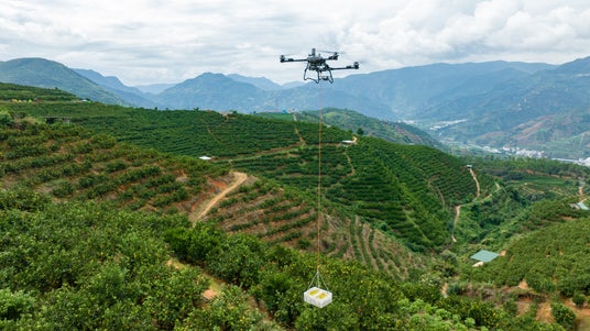 [ 吊り上げ運搬(ホイスト)対応 ]最大約65kgの荷物を持ち上げ可能。自動スイング抑制、積み下ろし地点への自動飛行、リアルタイム重量検知などの機能で安全な輸送を実現。