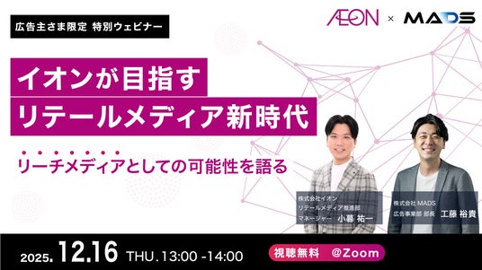 株式会社MADS(本社:東京都、代表取締役CEO:穴原 誠一郎)は、イオン株式会社(本社:千葉県、取締役 代表執行役社長:吉田 昭夫)のリテールメディア推進部 マネージャー 小暮祐一 氏をゲストに迎え、2025年12月16日(火)13:00~14:00に共催ウェビナー「イオンが目指すリテールメディア新時代──“リーチメディア”としての可能性を語る」を開催します。