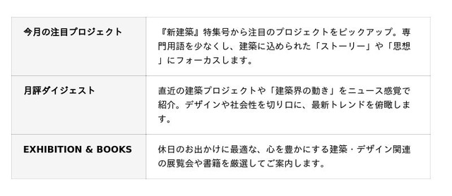 1.『新建築』の内容を凝縮した建築情報番組月刊誌『新建築』の内容を約15分間に要約し、社会的な視点も交えながら、建築の最新情報やトレンドも交えたカルチャー番組としてお届けします。