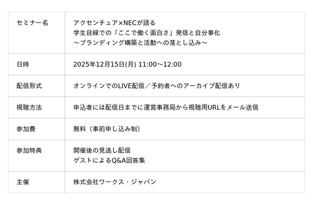 株式会社ワークス・ジャパン(本社:東京都千代田区、代表取締役:清水信一郎)は、2025年12月15日(月)に企業の人事担当者及び人材開発担当者を対象にしたオンラインフォーラム、WORKS REVIEW『アクセンチュア×NECが語る 学生目線での「ここで働く面白さ」発信と自分事化~ブランディング構築と活動への落とし込み~』を開催します。