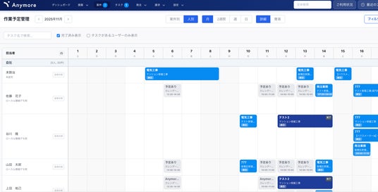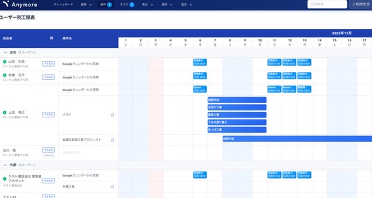 本機能では、「Anymore施工管理」で登録した予定に加え、Googleカレンダー連携により取得した各ユーザーの予定を同一画面上で確認することができます。これにより、案件に関わるすべての関係者のスケジュールを一元的に把握し、最適なタイミングでの作業依頼が可能となります。