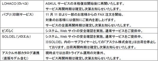 弊社サービスの復旧は、事業所のお客様の業務継続を最優先ととらえ、ASKUL(事業所向け)サービスを先行して対応を進めております。サービスのWebサイトは、セキュリティ対策の強化を実施し安全性を確認したうえで再開、出荷は安定稼働を確認しながら順次拡大してまいります。