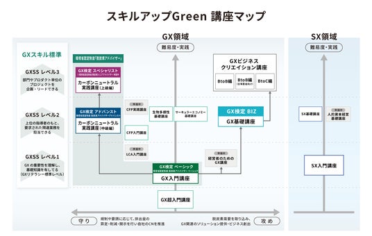 スキルアップNeXtは、「スキルアップGreen」でGXを体系的に学べる講座や、GX推進に必要な知識やスキルを測る「GX検定」で企業のGX推進をワンストップでサポートしています。経産省主導のGXリーグにおいて、2024年度よりGX人材市場創造WGを立ち上げ、リーダー企業として、GX人材の役割や必要なスキルを定義した「GXスキル標準」を策定しました。