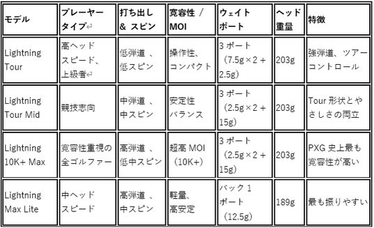 このシステムを支えるのが、スパインドソールデザインと従来比最大84%拡大したカーボンファイバー構造を採用した新設計です。これにより余剰重量をヘッド周辺に再配置でき、展開する4モデルすべてにおいて非常に高いMOIを可能にします。モデルは Lightning Tour / Lightning Tour Mid / Lightning Max-10K+ / Lightning Max Lite の4種を展開。各モデルには PXG精密ウェイト調整システム が搭載され、打ち出し角、スピン量、左右のショット傾向(ドロー/フェード)を自在に調整可能です。中でも Lightning Max-10K+ は、USGA規定上限に迫る安定性を実現しています。