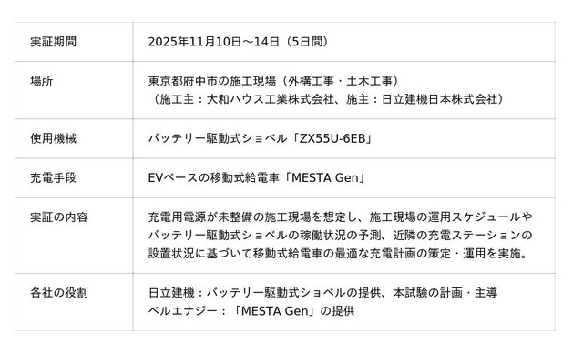 ベルエナジー株式会社(所在地:茨城県つくば市/以下、ベルエナジー)は、日立建機株式会社(所在地:東京都台東区/以下、日立建機)と共同で、2025年11月10日から14日まで、東京都府中市の施工現場において、当社の移動式給電車「MESTA Gen(メスタ・ジェン)」を活用したバッテリー駆動式ショベルへの電力供給実証試験を実施いたしました。