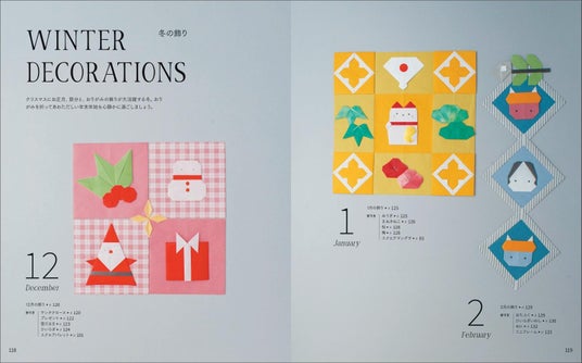PART2では、四角いタイルの上に季節のモチーフを組み合わせて作る、12ヶ月の飾りを紹介しています。部屋に吊るして、壁に貼って。クリスマス、お正月、節分、こどもの日、七夕、お月見、ハロウィンと、季節のおりがみをお届けします。