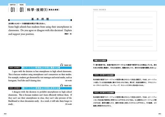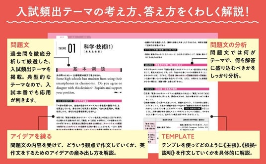 テンプレを学んだあとは、入試頻出のテーマ別(科学・技術、自然・環境、社会・文化、教育・学校など計10テーマ)に「基本例題」「応用例題」でトレーニングし、テンプレを自分のものにしていきます。【本書で扱うテーマ】