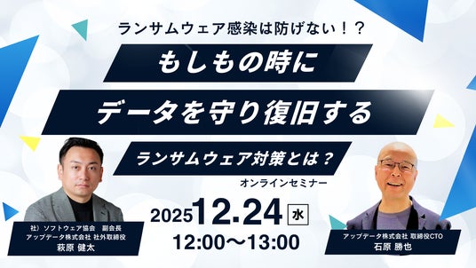 こうした背景を踏まえ、データセキュリティの専門家であるアップデータ株式会社(東京都千代田区、代表取締役社長:小川 敦)は、2025年12月24日(水)12:00より、萩原健太氏、同社取締役CTOである石原勝也氏による「ランサムウェア感染は防げない!?もしもの時にデータを守り、復旧するランサムウェア対策とは?」ウェビナーを開催します。