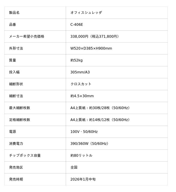 C-406Eは、最大約30枚/28枚(50/60Hz・A4上質紙64g/平方メートル 縦方向)を細断することができるハイコストパフォーマンスシュレッダです。投入口の幅は約305mmあり、A3サイズに対応しています。また耐久性に優れたスチール製の筐体を採用しています。便利で安全な機能を搭載
