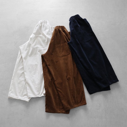 ベストは今回のTIMELINEクラウドファンディングのために企画開発したもの。パンツはHUISの定番4型。国産コーデュロイを使用し、それぞれクラウドファンディング限定の3色で限定生産します。