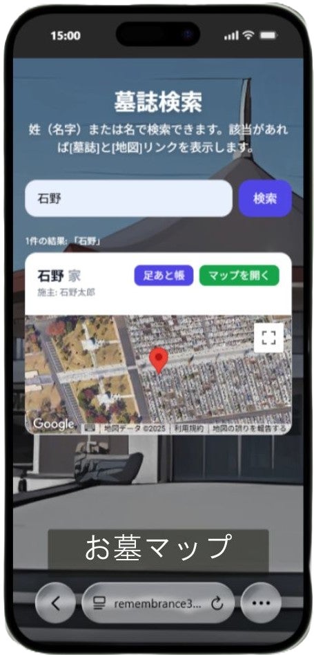 神明寺(千葉県市川市)樹木葬墓地に導入。参拝者はスマートフォンでQRコードを読み取るだけで、先祖・故人の遺影や記録に触れる個別供養が可能となり、遺族の心の安心につながる新しいお墓参りの形を実現されています 。多様化する供養のニーズに応え、「先祖とつながる場所」を守り続ける という寺院の理念を実現しています。(施工:千葉石材)