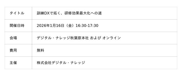 eラーニングアワード2025「OJT活用特別部門賞」を受賞した「人材育成・訓練課題対応のため、eラーニングとVR、OJT記録ツールを連動し活用した革新的な教育手法」をはじめとした訓練DXをご紹介する、「訓練DXで拓く、研修効果最大化への道」セミナーを無料で開催いたします。