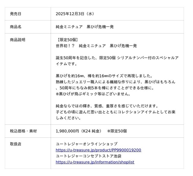 株式会社ユートレジャー(本社:東京都新宿区、代表取締役社長:青木 興一、株式会社ケイ・ウノの連結子会社)は、50周年を迎えたロングセラーパーティーゲーム「黒ひげ危機一発」(発売元:株式会社タカラトミー)とコラボレーションした世界初「純金ミニチュア 黒ひげ危機一発」を2025年12月3日(水)よりユートレジャーオンラインショップ、ユートレジャーコンセプトストア池袋にてご購入いただけます。50体の数量限定です。