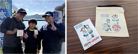 このイベントに参加した人には「放課後ていぼう日誌」コラボのキャンバスポーチとオリジナルステッカーをプレゼントしました。キャンバスポーチは釣りをする際に小さな仕掛けを入れるのに適したサイズとなっています。使用したイラストは海と日本プロジェクトのために作者の小坂泰之さんが描き下ろした新イラストです。このグッズを目にしたときには、この活動の事を思い出してごみを拾う意識を持ち続けてほしいとの願いを込めています。