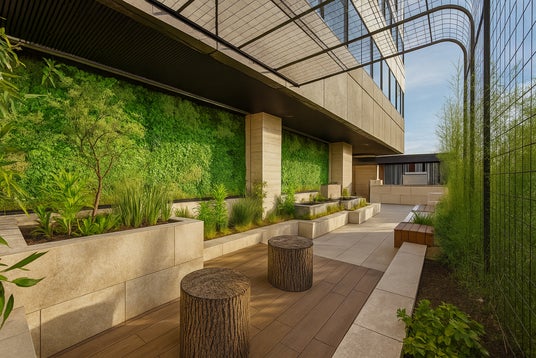 緑豊かな外構空間は人が滞留できる空間となっており、リジェネラティブな価値を発信する場所を目指します。(イメージ)
