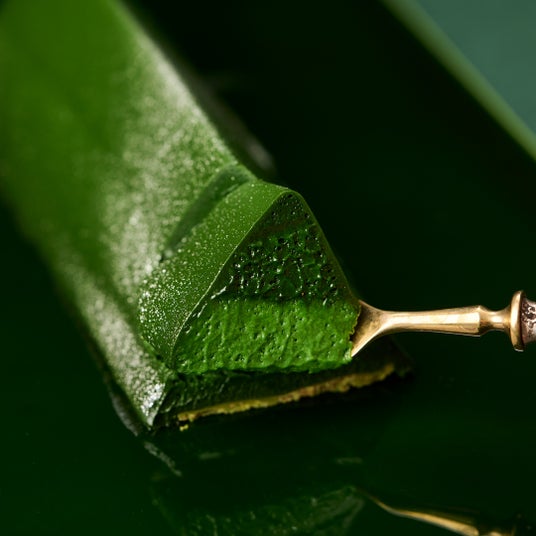 より抹茶感を引き立たせるために、ケーキのベースとなるサクサク食感の「ショコラフィユティーヌ」は碾茶を使用し、その上には、濃厚な抹茶の旨味と甘味を味わえるように、塩味を効かせた「焙煎抹茶塩ガナッシュ」を添え、さらに口溶けなめらかでバランスの良い「お薄茶ショコラムース」、濃厚な「お濃茶ショコラムース」を一層づつ重ねた、贅沢なハーモニーがポイント。5層目には、上品で大人なほろ苦さを添える「抹茶ショコラ・グラサージュ」でコーティングし煌びやかに仕上げました。