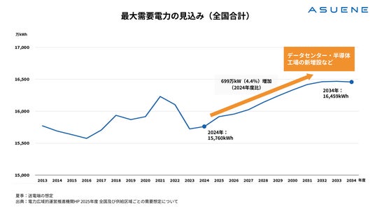 日本でも世界の流れと同様に、AIやDXの進展に伴って電力需要が増加傾向にあります。実際に、2024年の電力需要量が約1.5億kWh、2034年にかけて約1.6億kWhに拡大し、これは2024年度と比較して、699万kW(4.4%)増加する見通しとなります。その背景には、製造業やデータセンターといった電力集約型産業の成長に加え、再生可能エネルギー導入の拡大や電動車・産業電化の進展による電力需要の増加があります。