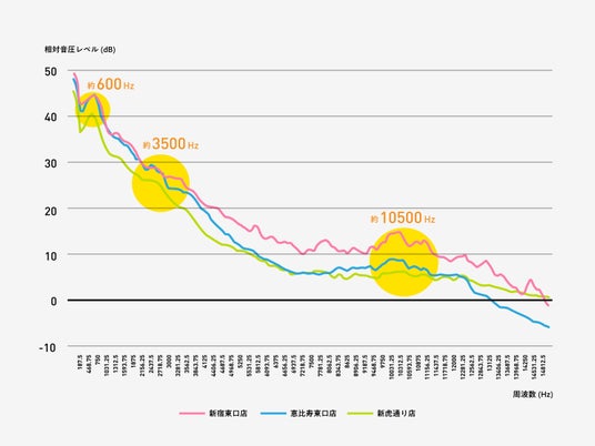 日本音響研究所がBGMや会話で騒がしい店舗*3で音を分析をしたところ、600ヘルツ・3,500ヘルツ・10,500ヘルツを中心とする周波数帯に音のエネルギーが集中し、山(極大)を持つことが分かりました。災害発生後の店内においても不特定多数の利用客の声が行き交い、同様の音環境になることが想定されます。このような環境下において、利用客に安全確保の声かけを届けるためには、大きい音を出すことを前提に3,500ヘルツ~5,000ヘルツの周波数成分が強い声を出すことが有効であることが示唆されました。男性・女性に関わらずなるべく高い声を発声することで、3,500ヘルツ~5,000ヘルツの周波数成分を有する声の成分(倍音)が強くなります。また、高い声を発声する(声帯の振動数を高める)ことで、肺からの空気量が多くなり音圧が上昇するので、大きな声を出すこともできます。
