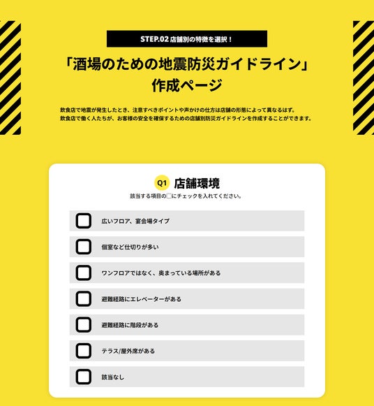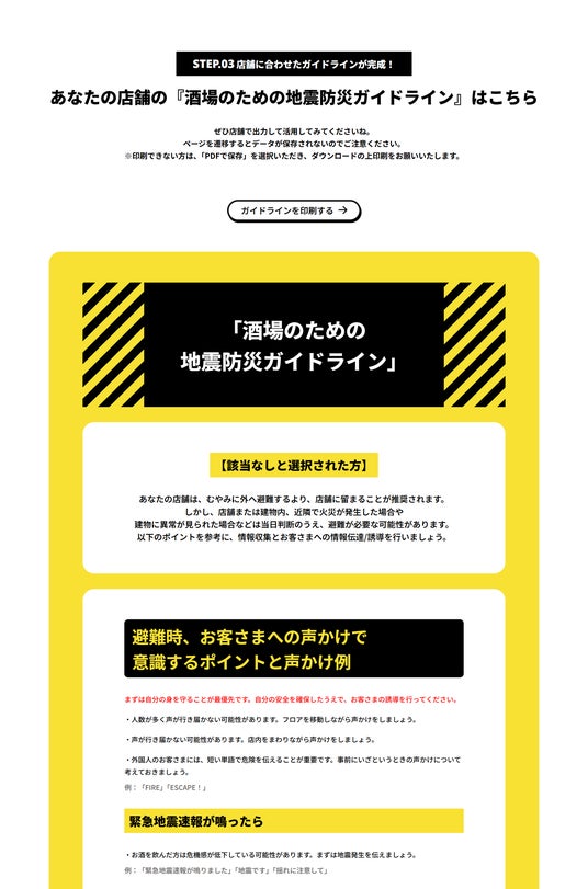 自身が従事する酒場の耐震性・地理的情報・店舗環境・店舗設備・顧客特性をWEB上で選択していくことでオリジナルの地震防災ガイドラインを生成することができます。生成したガイドラインには、地震の状況や段階に応じて注意すべきポイントと飲酒者を想定した安全確保の声かけの例が表示されます。画像で保存いただくことでいつでもご覧いただくことができます。100%安全を保証するものではありませんが、自店舗に合わせて、地震が起きたらどこに危険があるか、どんな対策・対応ができるかを考えるきっかけとして活用いただきたいです。なお、全部で2,432通りのガイドラインを作成可能です。