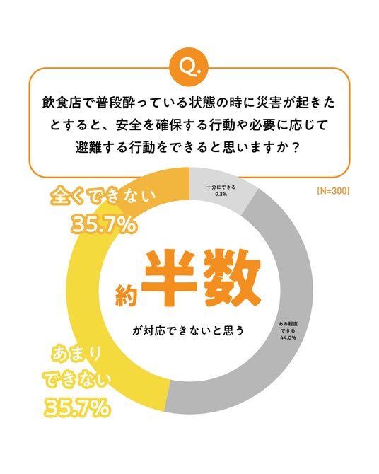 また、飲食店で普段酔っている状態の時に災害が起きたとすると、安全を確保する行動や必要に応じて避難する行動をできると思うか聞いたところ、約半数の人が対応できない(全くできない・あまりできない)と回答しました。不慣れな場所である飲食店において、利用客の半数が適切な防災行動ができない可能性が高いことが示唆されました。