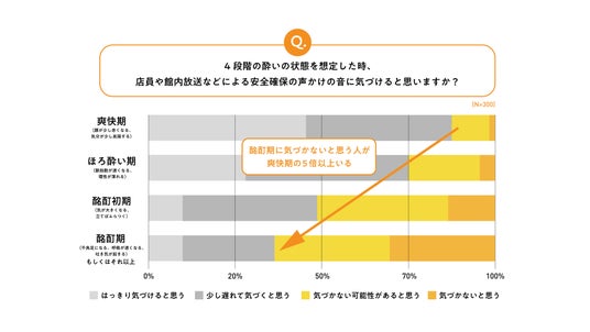 その3.│酩酊期に店員などによる声かけに気づかないと思っている人が爽快期の5倍以上いる