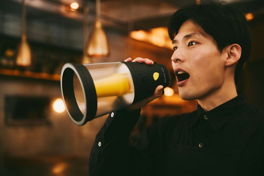 酒場のような騒音環境下で安全確保の声かけを届けるためには、なるべく大きく、高い声を出すことが有効です(※メカニズムについては後述)。しかし、地声で出せる声の大きさ・高さには限界があります。そこで、大きい音に出力できるだけでなく、発声した声が酒場でも届きやすい3,500ヘルツ~5,000ヘルツの周波数成分を有する高い声に変換される、酒場のための防災用電子メガホン「キコエール」のコンセプトモデル*2を日本音響研究所・ノボル電機・quantumと共同で開発しました。