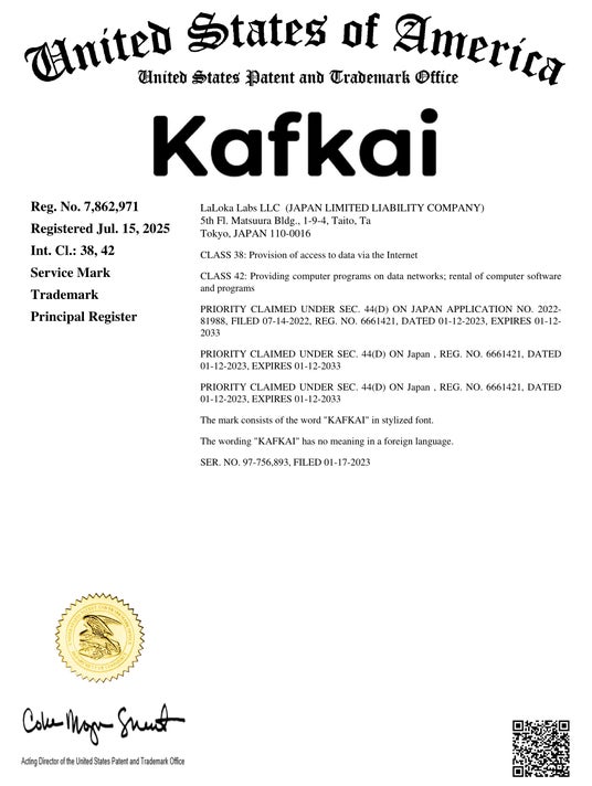 合同会社LaLoka Labs(ラロカラボ)(本社:東京都、代表社員CEO:イクバル・アバドゥラ)が開発・提供するAIコンテンツ生成サービス「Kafkai」(カフカイ)は、米国特許商標庁(USPTO)にて「Kafkai」名称の商標登録を正式に取得いたしました(登録番号:No. 7862971)。これにより、今後のグローバル展開、とりわけ米国市場におけるブランド保護体制を一層強化してまいります。