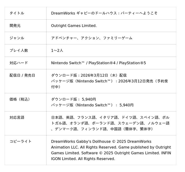 株式会社Phoenixx(フィーニックス)(東京都武蔵野市、代表取締役社長:坂本 和則)は、アドベンチャーゲーム『DreamWorks ギャビーのドールハウス:パーティーへようこそ』について2026年3月12日(木)よりNintendo Switch(TM) / PlayStation(R)️4 / PlayStation(R)️5向けに、販売を開始することをお知らせいたします。