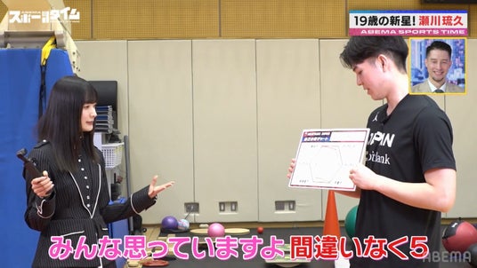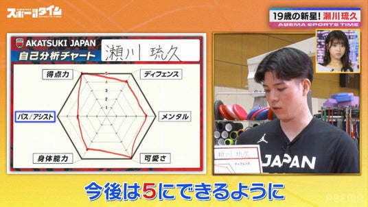 さらに番組では、Bリーグチームの千葉ジェッツに所属する瀬川琉久選手を取材。櫻坂46の大園玲さんがインタビューし、5段階評価の自己分析チャートに記入してもらいました。得点力、パス/アシスト、ディフェンス、メンタル、身体能力、可愛さの6項目の中で最も点数が高かったのは、得点力。「今シーズンはまだ得点力を出せていないんですけど、高校の時から得点することのは自分の武器でもあったので、今後の伸び代を含めました」と語る一方、パス/アシストについてはまだ課題が残るとして3点をつけた瀬川選手。4点をつけたメンタルに関しても「皆さんからは“ルーキーには見えない”と言っていただいているんですけど、怖がりだし、緊張することもあって。周りからは5に見えるかもしれないけど、勝負所で弱かったりもするので4くらいかなと思います」と冷静にコメント。大園さんから「自分に厳しいタイプって感じですね」と言われると「そうなんですかね、わかんないですけど…」と微笑みました。また、自身の武器である得点力と同じ5点をつけた可愛さについて、「まだルーキーで19歳なので、自分では思ってないですけど5にしました」と自信ありげにコメントした瀬川選手。「きっとみんな思ってますよ。間違いなく5です」とアイドルである大園さんから太鼓判を押され、「わかりました。ありがとうございます」と照れ笑いを浮かべる姿に、スタジオのまるぴさんは思わず絶叫。佐々木さんも微笑ましいやり取りに笑顔を見せつつ、「アジア予選は長い戦いになってくるので、現状のホーバスジャパンは若手枠を使える状態ではない。ただPGで仮にケガ人が出たりした場合、すごく重要になってくるプレイヤーですね」と瀬川選手のこれからの活躍に期待を寄せました。