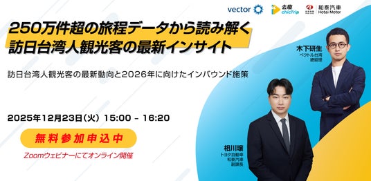株式会社ベクトル(本社:東京都港区、代表取締役会長兼社長:西江 肇司、東証プライム:6058、以下ベクトル)の台湾法人であるVector Group International Limited(Taiwan)(所在地:台北市、総経理 木下 研生、以下ベクトル台湾)は、トヨタ・レクサス・日野の台湾総代理店である和泰汽車が提供する台湾最大の旅程作成アプリ 去趣(chicTrip) と共同で、2025年12月23日(火)15:00~16:20にオンラインセミナーを開催いたします。本セミナーでは、2025年の訪日台湾人観光客の動向をデータと共に振り返りつつ、訪日関連トレンドを読み解きます。さらに、台湾市場に効果的な台湾インバウンドプロモーションの最新手法を、具体例を交えながら分かり易くご紹介します。