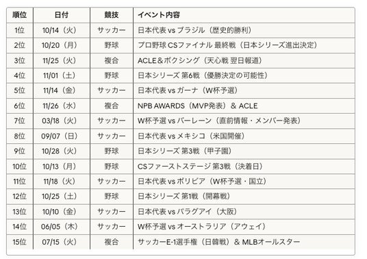 3位(11月25日)や6位(11月26日)には、ボクシングのタイトルマッチ(那須川天心戦など)やプロ野球の表彰式(NPB AWARDS)といったイベントが、ACLEなどサッカーの試合と重なりました。