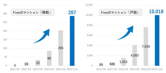 2021年1月に1棟目の顔認証マンションが竣工してから2025年11月末時点で287棟竣工・90社導入(企業数は竣工前含む)を経て、この度FreeiD導入マンションが1万戸を突破しました。1棟目の導入以来、入居者のうち97%が従来の鍵より便利、94%が次の物件にも顔認証を希望する※1という高い評価を頂きながら導入拡大を進めており、現在「FreeiDマンション」は北海道から沖縄県まで、全国15都道府県※2で展開しています。