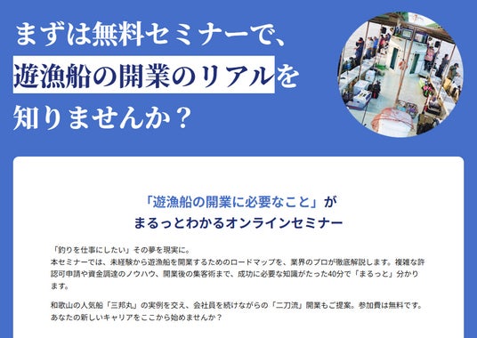 本サービスの開始に伴い、開業に必要なノウハウを解説する無料オンラインセミナー『「遊漁船の開業に必要なこと」がまるっと分かるオンラインセミナー』を、2026年1月22日(木)に開催いたします。