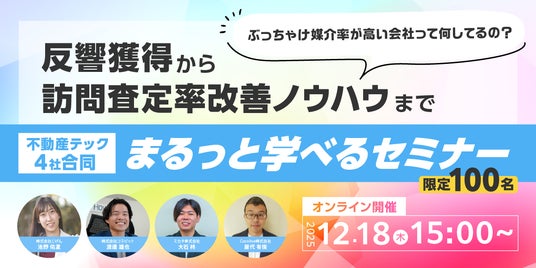 株式会社じげん(本社:東京都港区、代表取締役 社長執行役員CEO:平尾丈、東証プライム:3679、以下じげん)が運営する、不動産売却の一括査定サービス「イエイ」(https://sell.yeay.jp/)は、2025年12月18日(木)に無料オンラインセミナー『反響獲得から訪問査定率改善ノウハウまでまるっと学べるセミナー』を開催します。