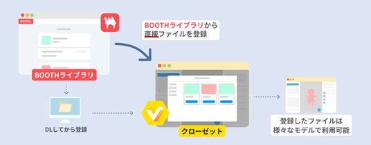 「クローゼット機能」を使うことで、BOOTHとVRoid Studioの連携が実現し、ユーザーがBOOTHで購入したアイテムを、BOOTHからワンクリックで直接VRoid Studio内の着せ替え機能(XWear)にインポートできます。これにより、PC内でのファイル管理の手間を省き、よりスムーズにアバターの着せ替えができるようになります。