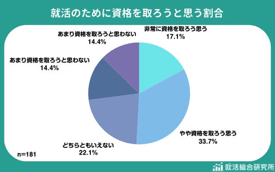 就活のために「非常に資格を取ろうと思う」(17.1%)と「やや資格を取ろうと思う」(33.7%)と答えた就活生はあわせて50.8%でした。