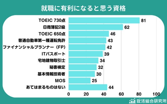 就職に有利になると思う資格は「TOEIC 730点」(81人)が最も多くなりました。