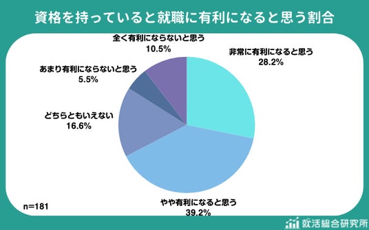 一方で、「あまり有利にならないと思う」(5.5%)、「全く有利にならないと思う」(10.5%)と回答した学生は16.0%にとどまり、資格取得の効果に否定的な層は少数派であることがわかりました。