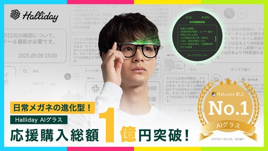 次世代AIスマートグラス「Halliday(ハリデー)」は、応援購入金額1億円を突破し、MakuakeプロジェクトAIグラスカテゴリーにて史上 No.1 の応援購入額更新いたしました!