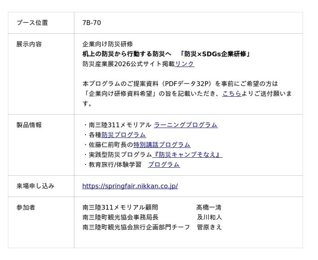 今回の防災産業展への出展は、震災から得た実践知をさらに多くの全国の企業・自治体と共有し、地域の枠を超えて「自然災害に備える社会づくり」に貢献するための取り組みでもあります。