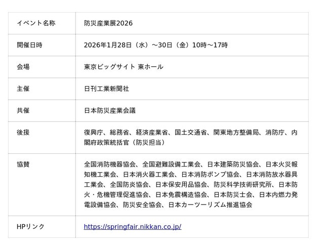 『防災産業展』は、防災・減災・危機管理に関する新技術やソリューションを紹介する展示会で、企業・自治体・防災関係組織のビジネスマッチングの場として開催されています。