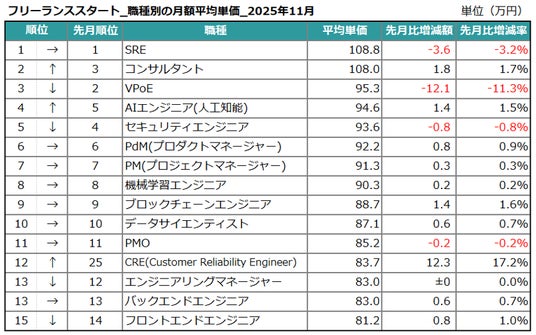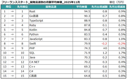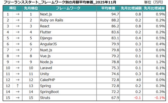 エン株式会社(本社:東京都新宿区、代表取締役会長兼社長:越智通勝)が運営するフリーランスエンジニア向け案件検索エンジン『フリーランススタート』(https://freelance-start.com/)では、サイトに掲載されたすべての求人の情報を集計し、分析を行なっています。2025年11月度の集計結果がまとまりましたので、お知らせします。