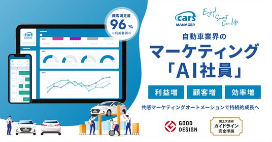 「cars MANAGER」は、自動車業界のマーケティングAI社員による顧客のカーライフに寄り添った共感マーケティングオートメーションサービスです。AIを活用した人とクルマのカーライフデータの収集・解析により、「経営支援」「集客支援」「複業支援」に利活用することで、持続的成長による「利益増」、「顧客増」、「効率増」を実現します。