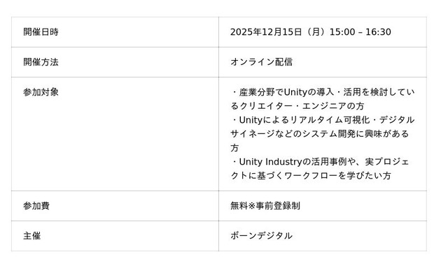 本セミナーでは、WOW inc.が Unity Industry を活用して制作した「気流・空気質のリアルタイム可視化デジタルサイネージ」を題材に、表現技術とシステム開発プロセスをわかりやすく解説します。産業分野でのUnity活用に関心のある方、導入を検討している方に有用な知見をお届けします。