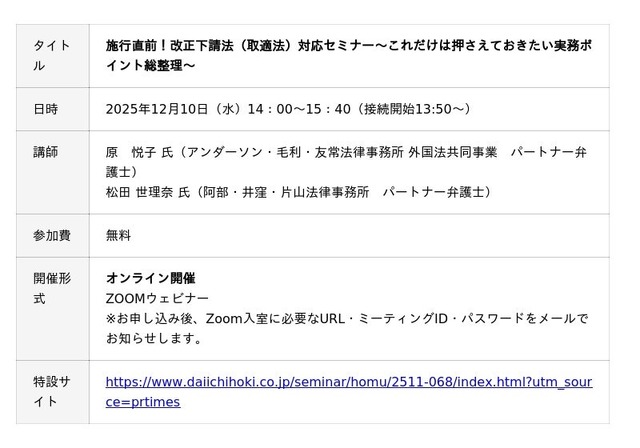 下請法改正に向けた企業取引研究会での検討に有識者委員として関与された原弁護士と松田弁護士を迎え、取適法の概要のみならず、社内運用におけるポイントなど、実務に沿う形で具体的な対応策について解説いただきます。