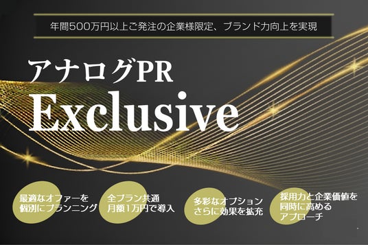 「企業の情報と印象をデザインする」をコンセプトに掲げ、メディアとWEBとオフラインを融合させたマーケティング戦略を提供する、株式会社アナログPR(本社:東京都港区、代表取締役:松浦啓介)は、新たなPRサービス「アナログPR Exclusive」を正式リリースいたします。本サービスは、弊社サービスを年間500万円以上ご発注いただいた企業様を対象に、月額1万円(12カ月契約)で多彩なPR支援を行う特別なオファーです。