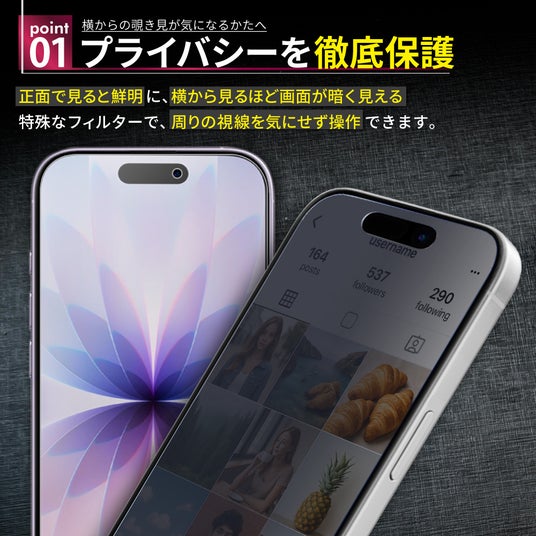ブルーライトを軽減し、目への負担を抑えるガラスフィルム。覗き見を防ぐプライバシー仕様に加え、高硬度ガラスで傷や衝撃にも強い設計。操作性を損なわない滑らかな指すべりで、日常使いをより快適にサポートします。
