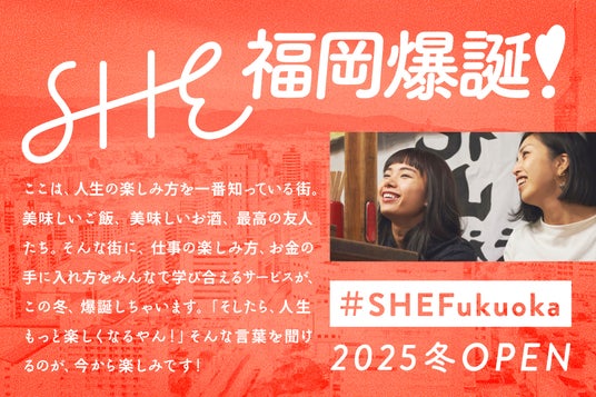女性のためのキャリアスクール「SHElikes(シーライクス)」を運営するSHE株式会社(所在地:東京都港区、代表取締役CEO/CCO:福田恵里、以下SHE)は、九州の新拠点「SHE Fukuoka」のオープンを記念し、「SHE Fukuoka オープニングパーティー」を、2025年12月13日(土)に開催いたします。イベント当日は福岡市長の高島宗一郎氏をお迎えし、SHE代表の福田恵里と「地方における女性のキャリアと街づくり」をテーマにトークセッションを行います。自治体・企業・地域コミュニティとの連携を深めながら、福岡を起点に九州全体の女性活躍推進を目指してまいります。