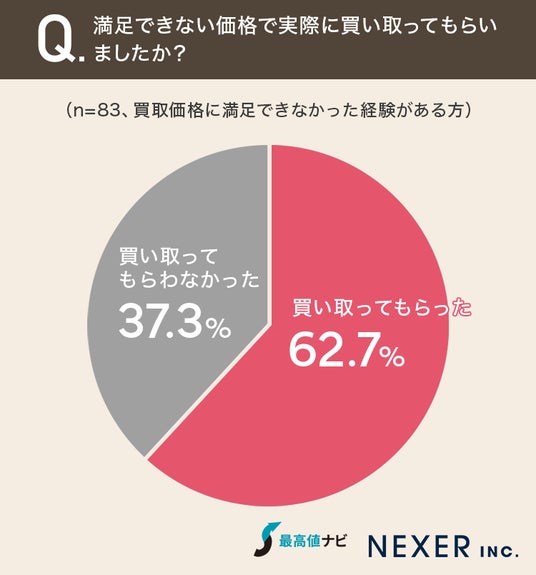 価格に満足しないまま買い取ってもらった方は、62.7%にのぼりました。
